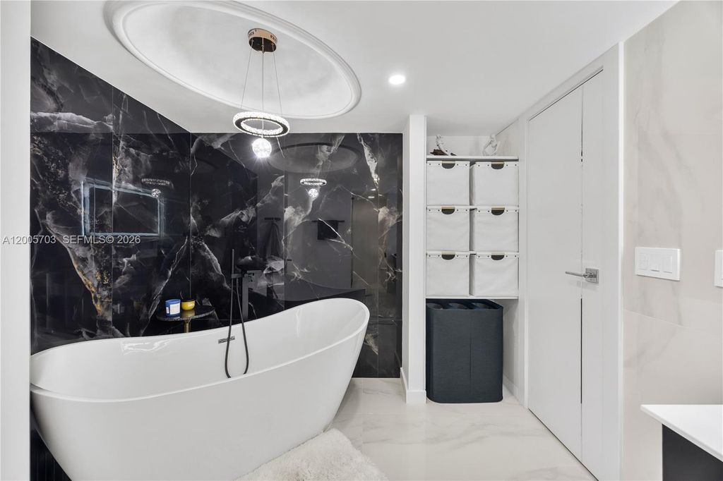 Beautifully renovated 1-bedroom, 2-bathroom apartment featuring a modern, elegant design throughout. The unit showcases white porcelain tile flooring and a stunning freestanding bathtub, creating a clean, spa-like atmosphere. The brand-new kitchen is thoughtfully updated with contemporary finishes, perfect for both everyday living and entertaining. This unique layout also includes a dedicated office space, as well as a versatile music/podcast room, ideal for creatives or working from home. Enjoy new impact windows and a sliding balcony door, bringing in natural light and energy efficiency. A cozy den adds extra flexibility for storage or a reading nook, while French-style ceilings enhance the character and charm of the home.