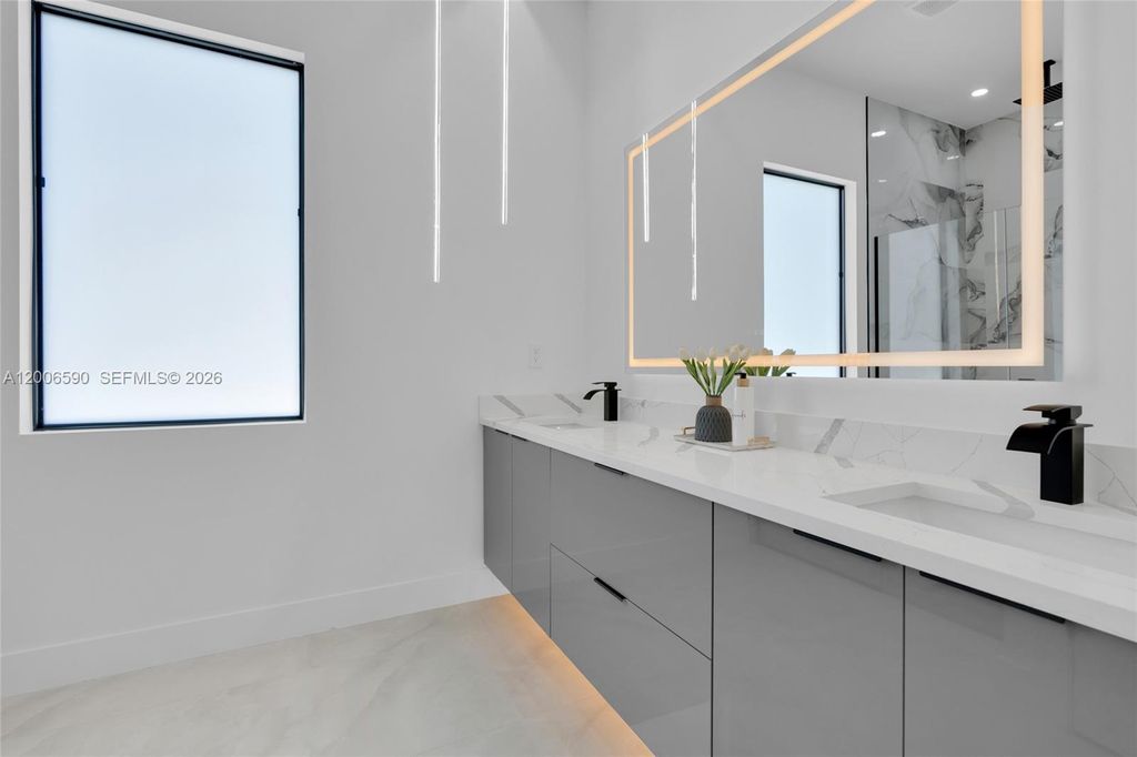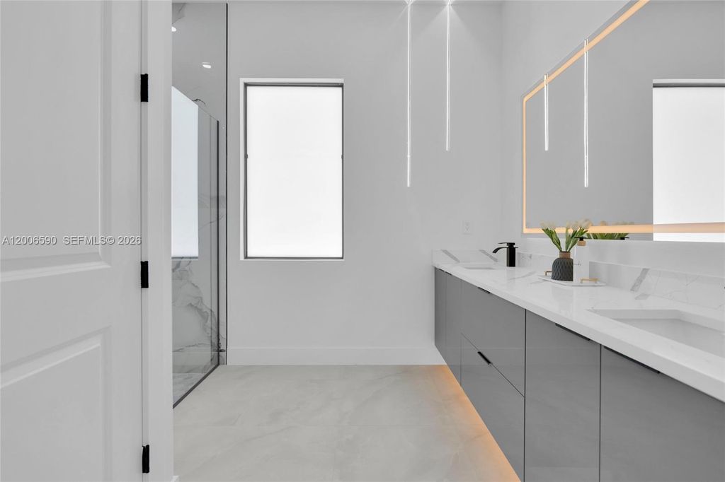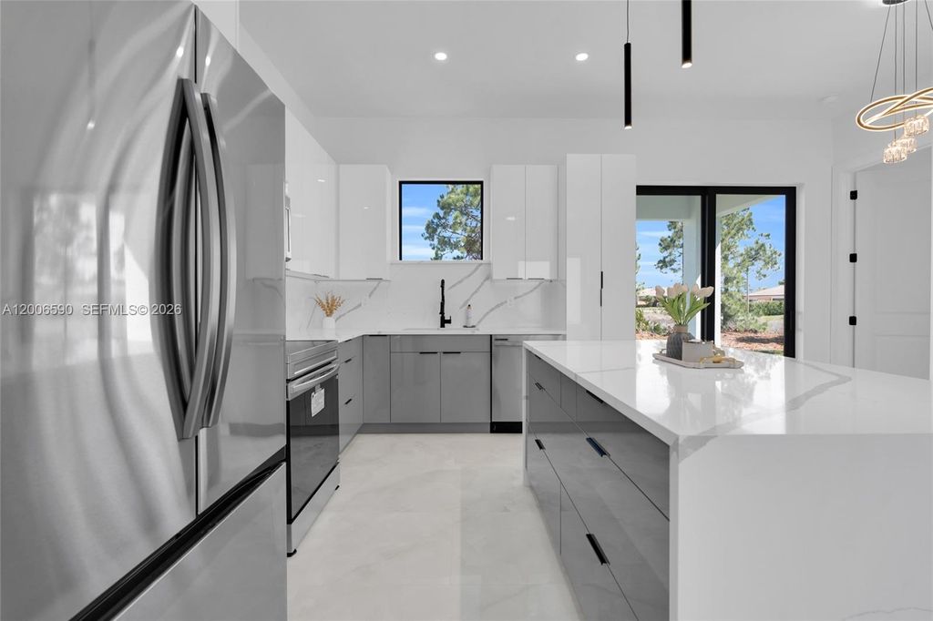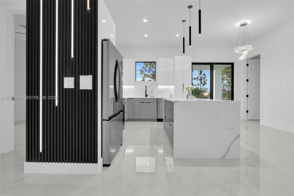 Beautiful home for sale in one of the best locations in Lehigh Acres. This modern residence features impact windows and doors, porcelain tile throughout, and elegant, high-end finishes. The kitchen and bathrooms showcase stunning Calacatta surface complemented by custom cabinetry throughout the home. This beautiful home features a modern LED lighting design. The property also includes a fully automatic sprinkler system covering the entire home and yard for easy maintenance. A perfect combination of style, comfort, and location. Every space feels bright, functional, and refined. Make your offer today!!!